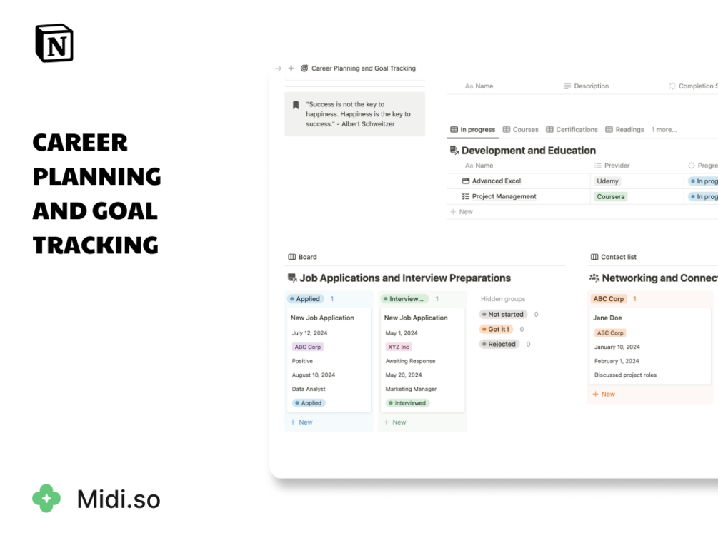 Achieve your career aspirations with our Career Planning and Goal Tracker Template. Stay focused, motivated, and organized as you work towards your professional goals. Ready to advance your career? Download now and start planning your future! And don't forget to explore more fantastic templates at Midi Notion Studio.