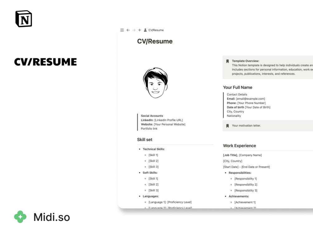 - ContactGet noticed and land your dream job with our Resume Template. Create a polished and professional resume that showcases your strengths. Ready to make your next career move? Download now and start crafting your standout resume! Plus, explore more fantastic templates at Midi Notion Studio.