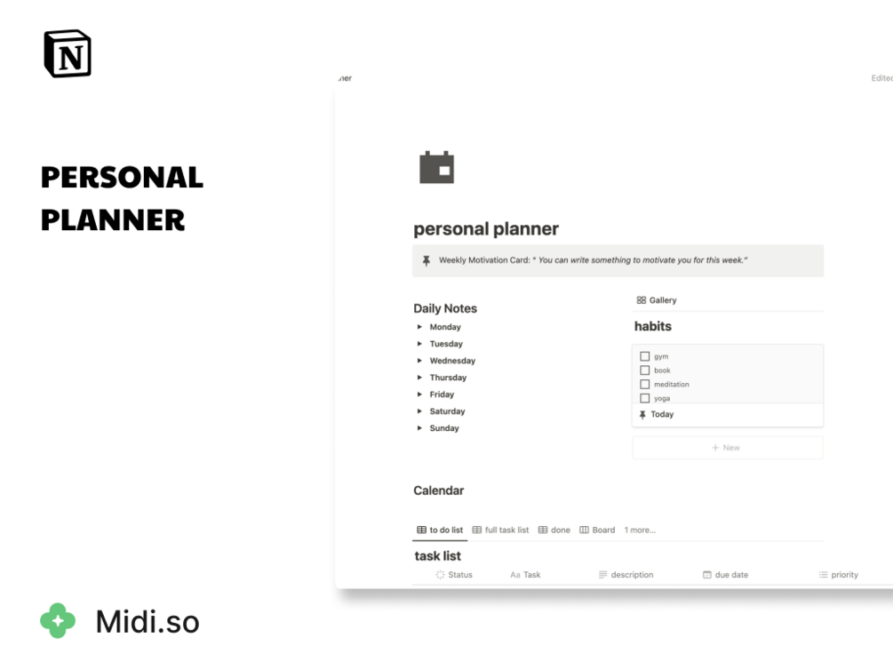 Stay organized and on top of your life with our Personal Planner Template. Whether you're managing your daily schedule, tracking your to-dos, this template has everything you need to keep your life in order. Make every day count with our Personal Planner Template. Achieve more and stress less by keeping all your important tasks and goals in one place. Ready to take charge of your schedule? Download now and start planning your success! And be sure to explore other wonderful templates available at Midi Notion Studio.