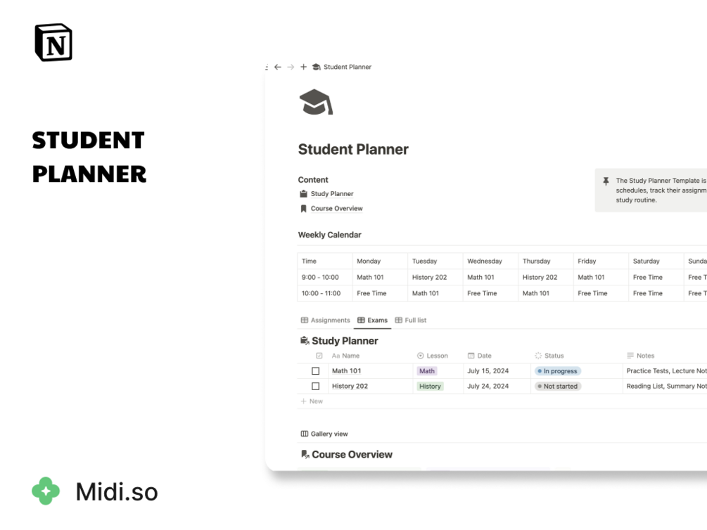 Stay ahead in your studies and manage your time like a pro with our Student Planner Template. Make studying more efficient and stress-free. Ready to boost your academic performance? Download now and start planning your way to success! Plus, discover more helpful templates at Midi Notion Studio.